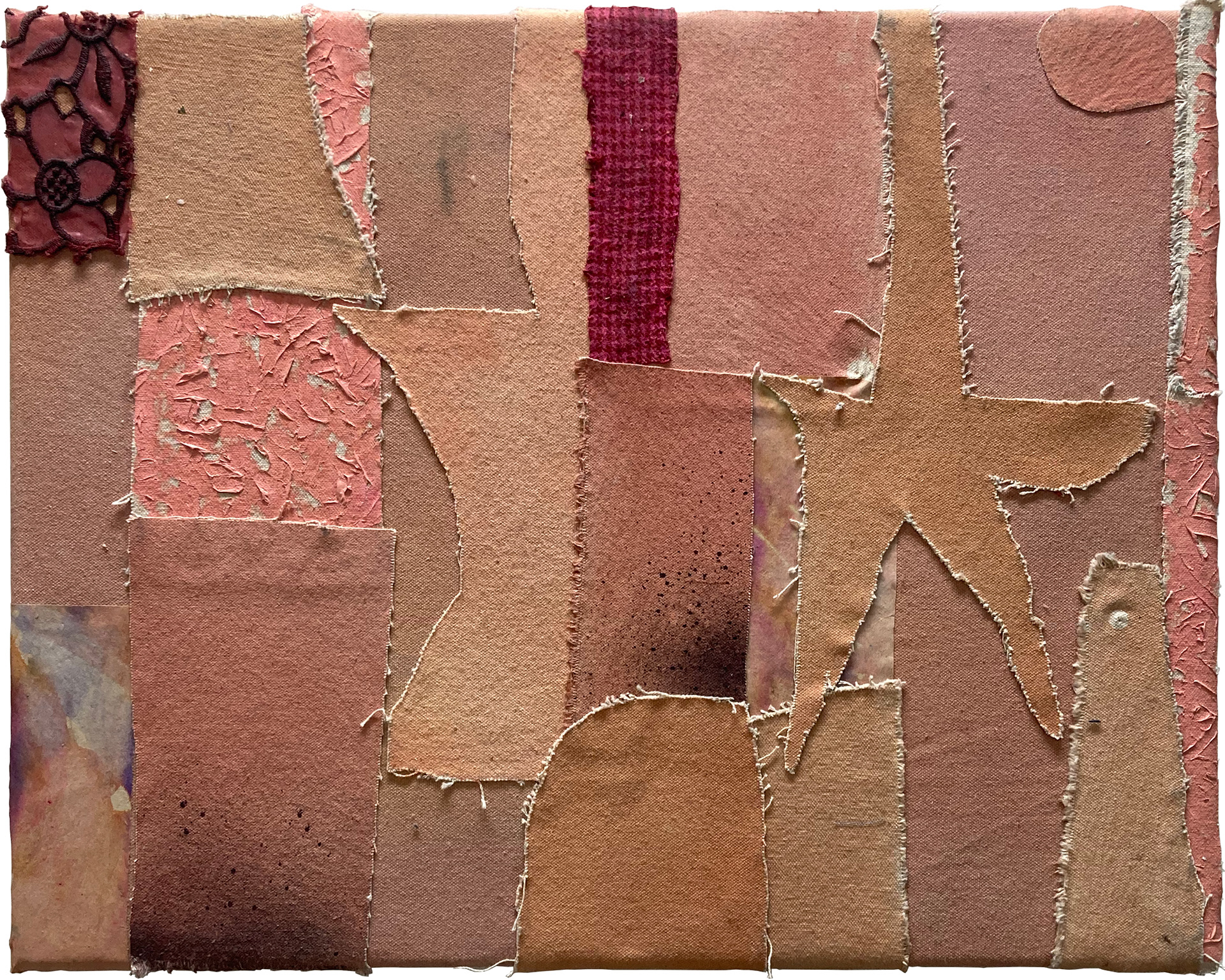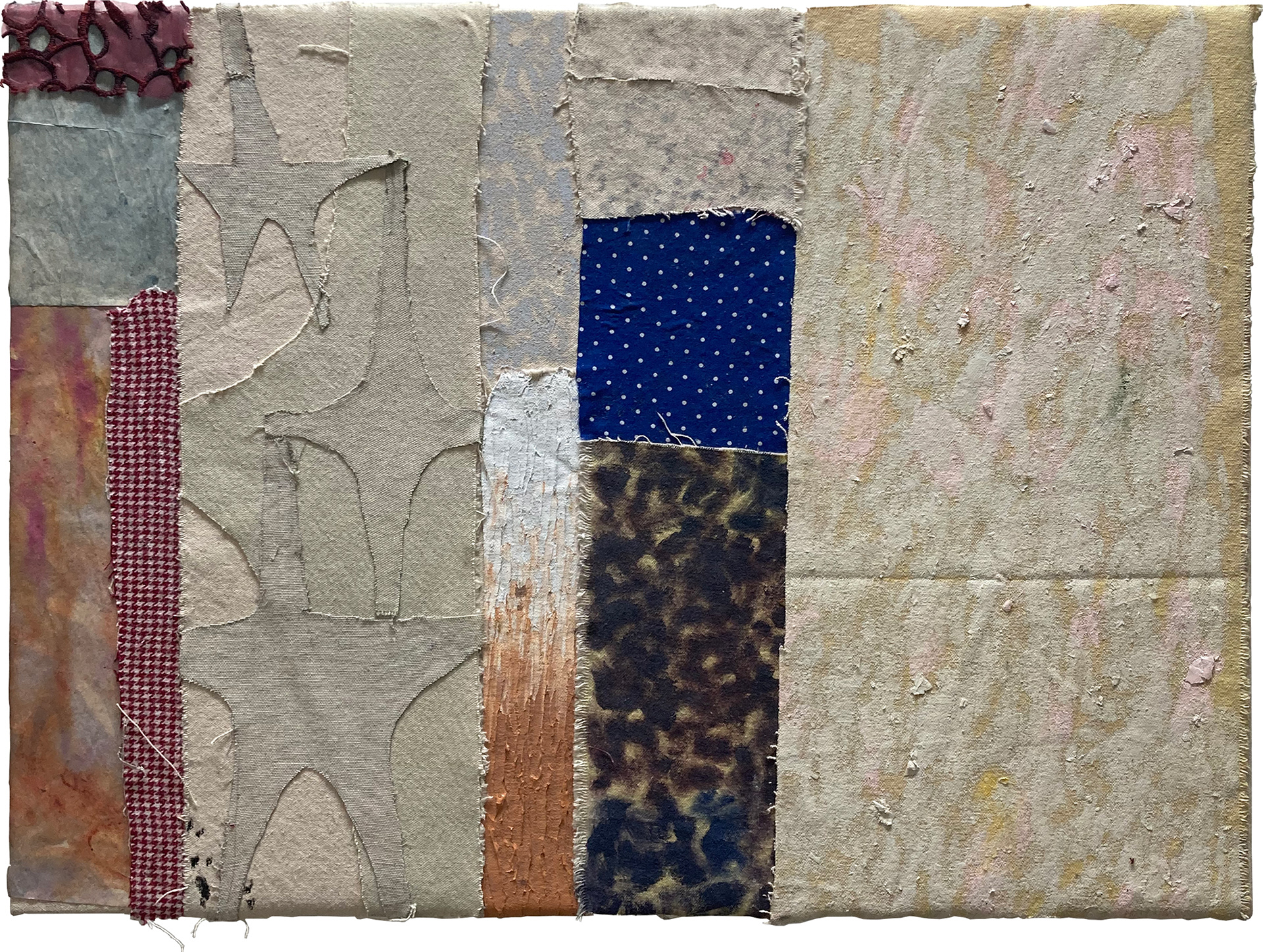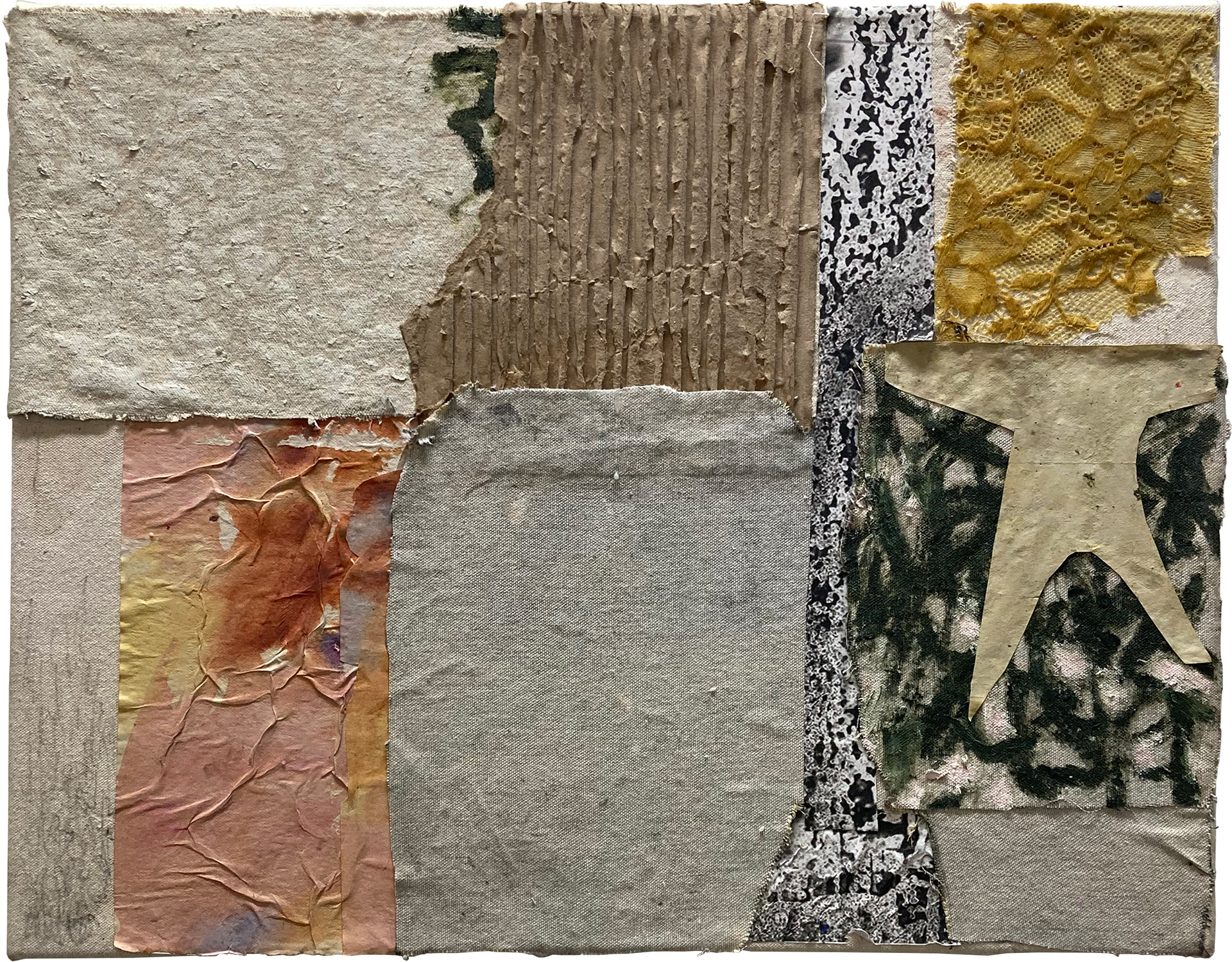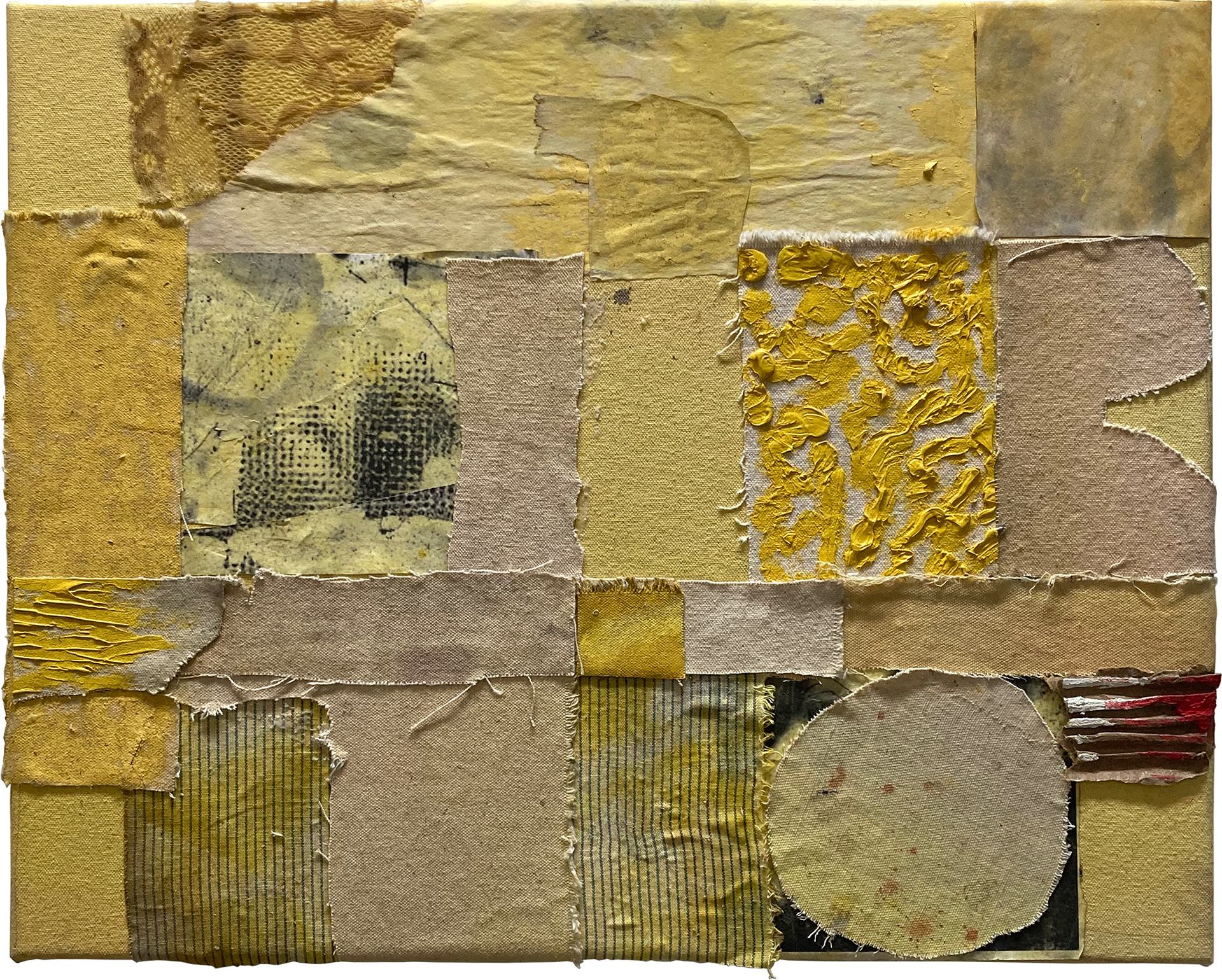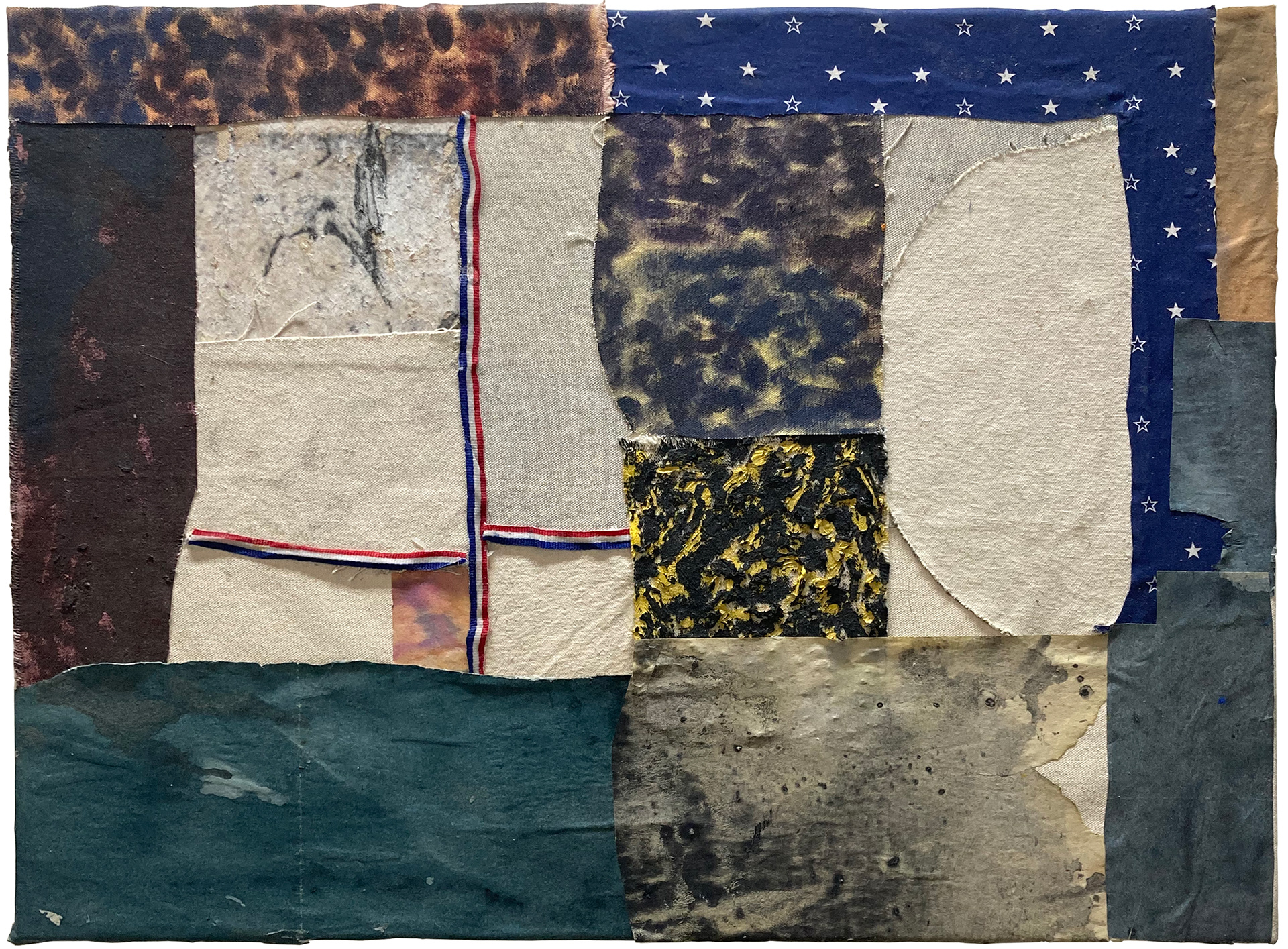 paper, ink, textile, wax, enamel paint, foil numbers, oil paint, canvas, glue over canvas/ 36" x 36"/ c. 2022