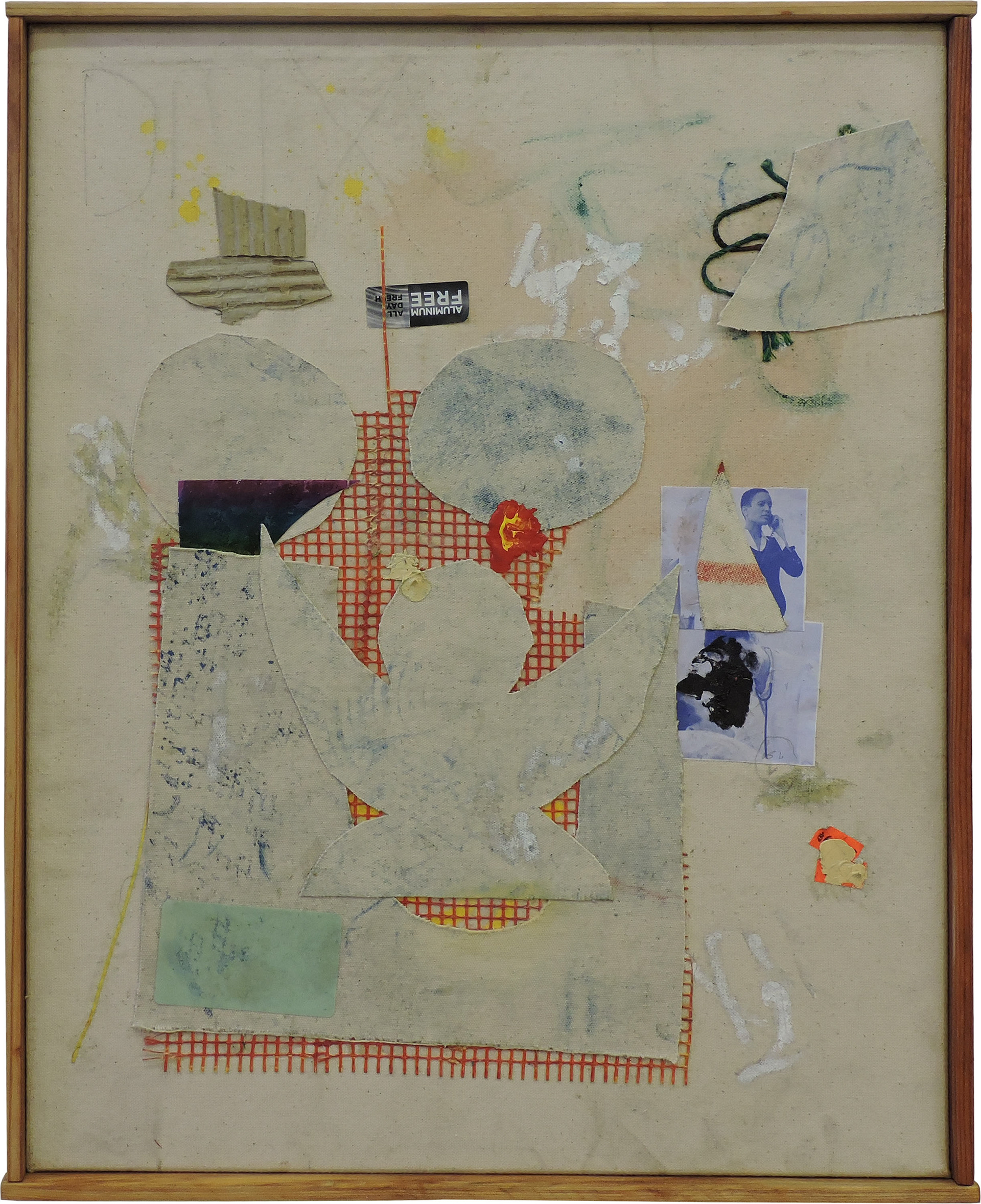 acrylic paint, spray paint, oil paint, magazine clipping, carpet, permanent ink, enamel paint, discarded packaging and labels, canvas, glue over canvas/ 54" x 60"/ c. 2020
