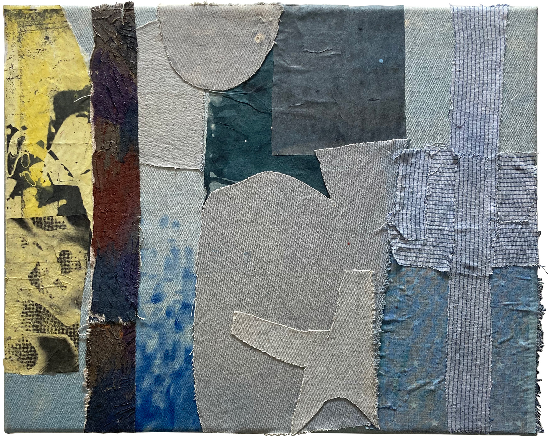 paper towel, blue oil, paper, acrylic paint, pom moms, cigarette box, canvas, glue over canvas/ 24" x 24"/ c. 2022